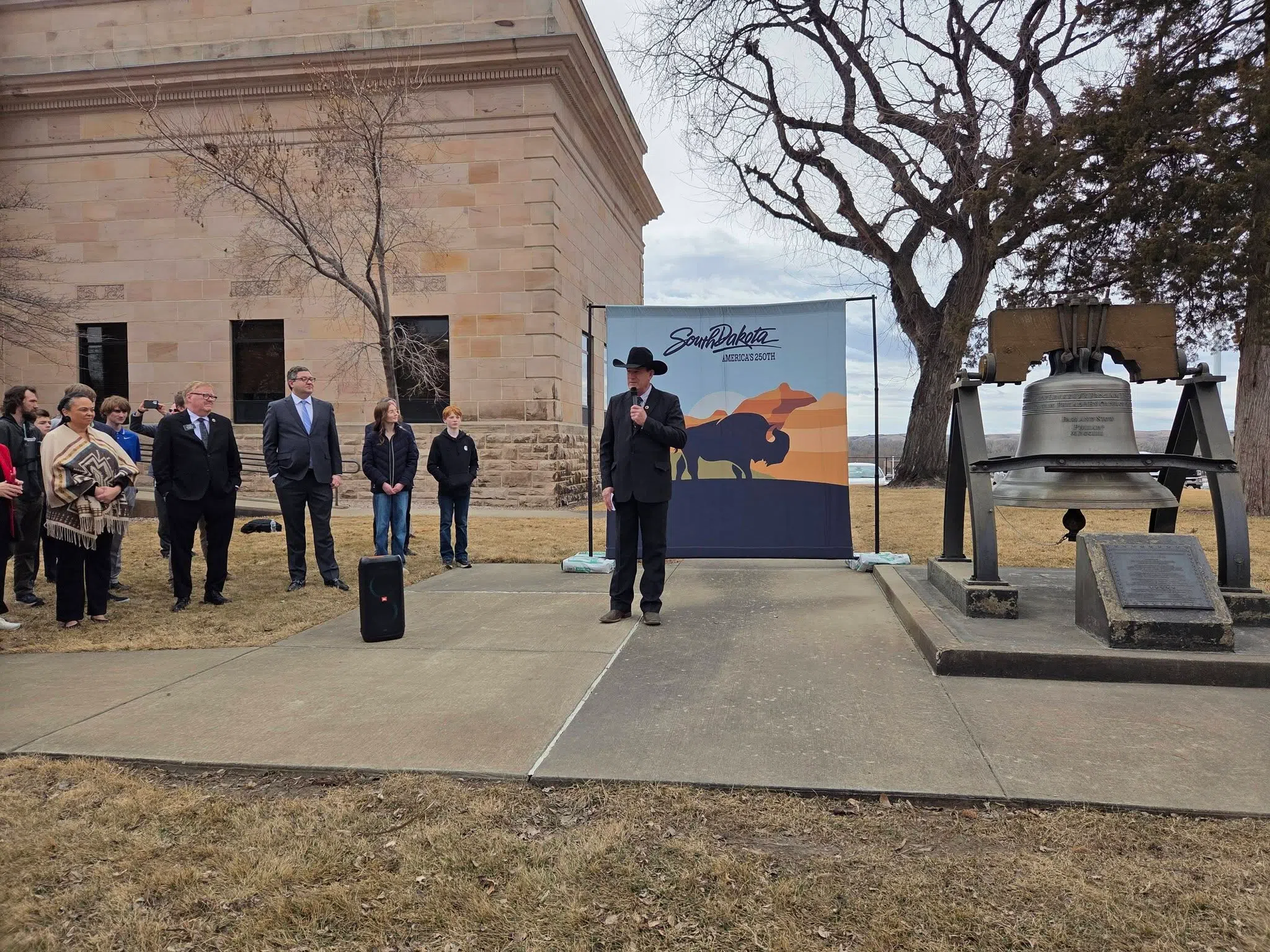 Governor Larry Rhoden with the help of two students rang the bell. State Historical Society Director Ben Jones says each state received a liberty bell in the 50’s in a post-war bond drive…